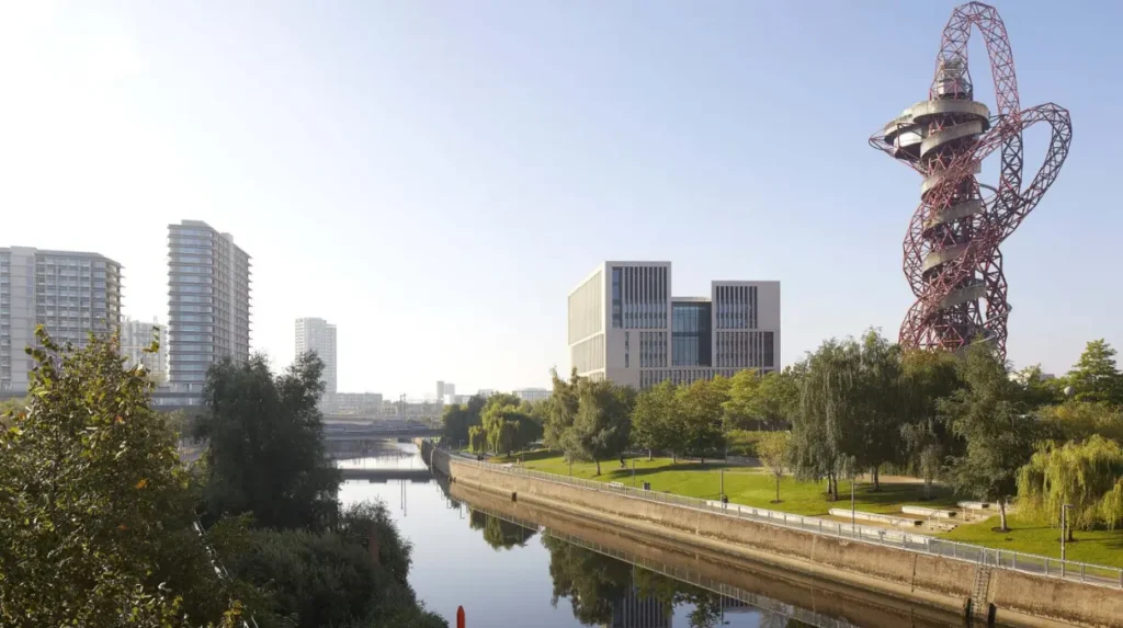 The campus masterplan envisions Phase 1 completion with 50,000 square meters of space for 4,000 students and 660 staff, expanding to 180,000 square meters by the 2030s with four additional buildings. Positioned on either side of the Waterworks River south of the ArcelorMittal Orbit, UCL East integrates seamlessly into Stratford’s landscape, promoting pedestrian links via Thornton Bridge and public access for community events. This strategic location in Newham borough leverages East London’s transport connectivity, including Stratford Station, to attract diverse talent while addressing local deprivation through inclusive design.