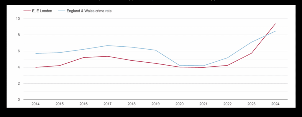The graph above illustrates how shoplifting trends in East London compare with the national picture. While East London consistently recorded lower rates than the national average between 2014 and 2021, from 2022 the pattern shifts. East London’s shoplifting rate increases at a faster pace than the national trend. By 2024, the borough records its highest shoplifting level in 10 years, signalling an escalation in shoplifting offences.