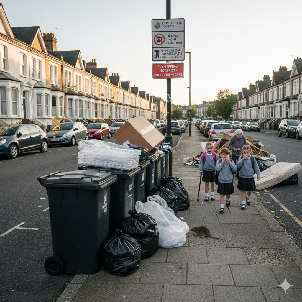 Overflowing bins lead to pests, smells, and more fly-tipping on East London streets. Councils face higher costs, affecting taxpayer services.