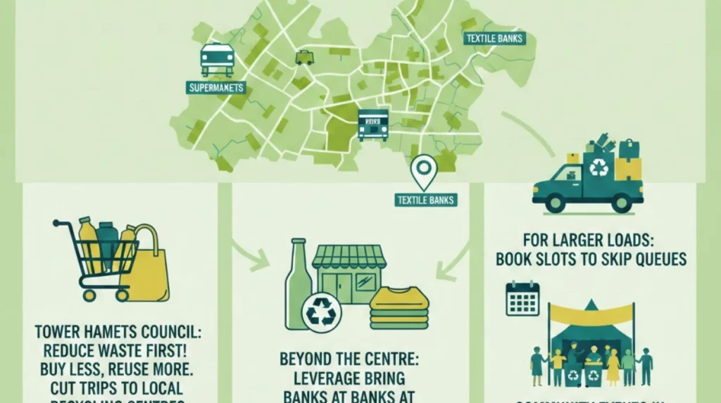 Beyond the center, leverage bring banks at supermarkets for bottles and textiles. Tower Hamlets Council promotes reducing waste first—buy less, reuse more. This cuts trips to the local recycling center in Tower Hamlets.
