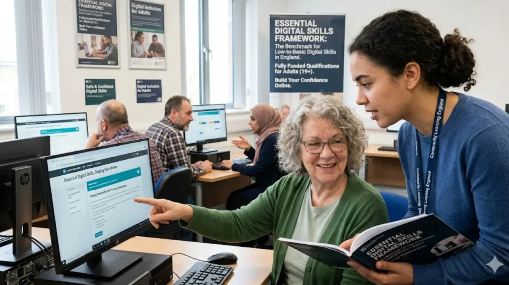 The national Essential Digital Skills framework is the clearest benchmark for low-to-basic digital skills training in England. It was created to define the skills adults need to benefit from the digital world safely and confidently, and it underpins the qualifications funded through the adult education system. These qualifications are intended for adults aged 19 and over with low digital skills, and are fully funded if they meet the eligibility rules.