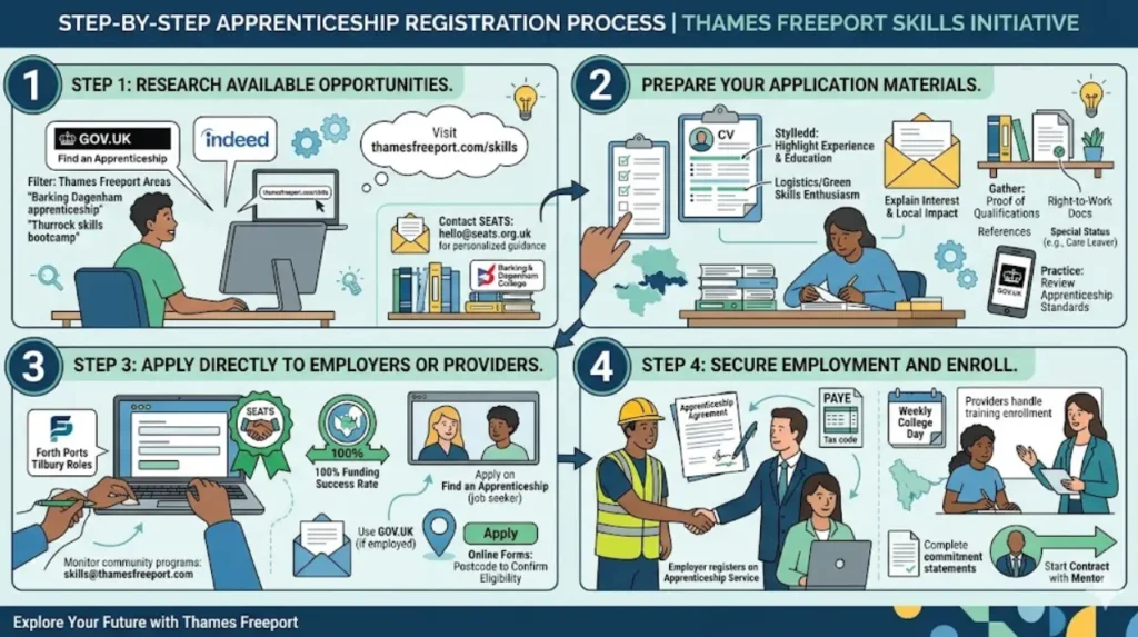Begin by exploring apprenticeship vacancies on national platforms like GOV.UK’s Find an Apprenticeship service or local job sites such as Indeed, filtering for Thames Freeport areas and keywords like “Barking Dagenham apprenticeship” or “Thurrock skills bootcamp.” Visit thamesfreeport.com/skills for Skills Accelerator updates and SEATS resources, which list funded programs in high-demand fields.