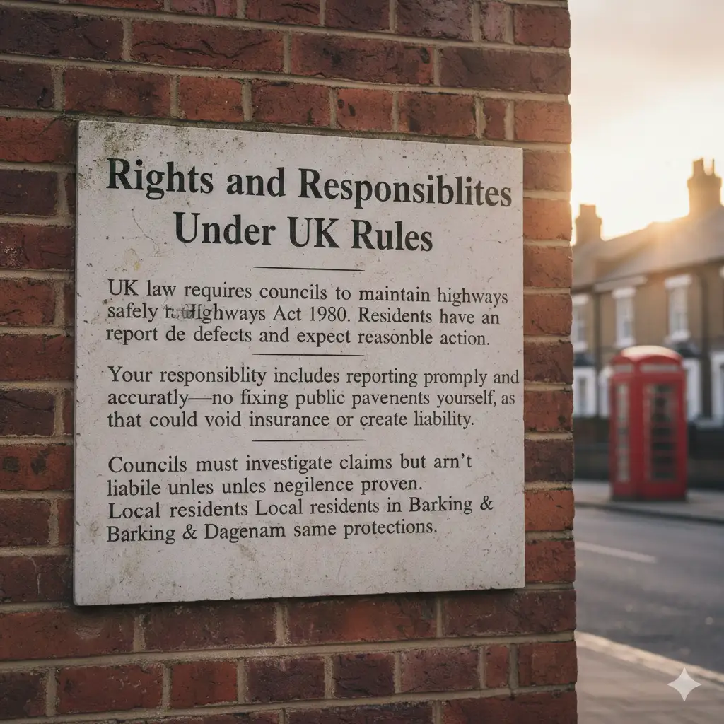 UK law requires councils to maintain highways safely under the Highways Act 1980. Residents have a right to report defects and expect reasonable action.