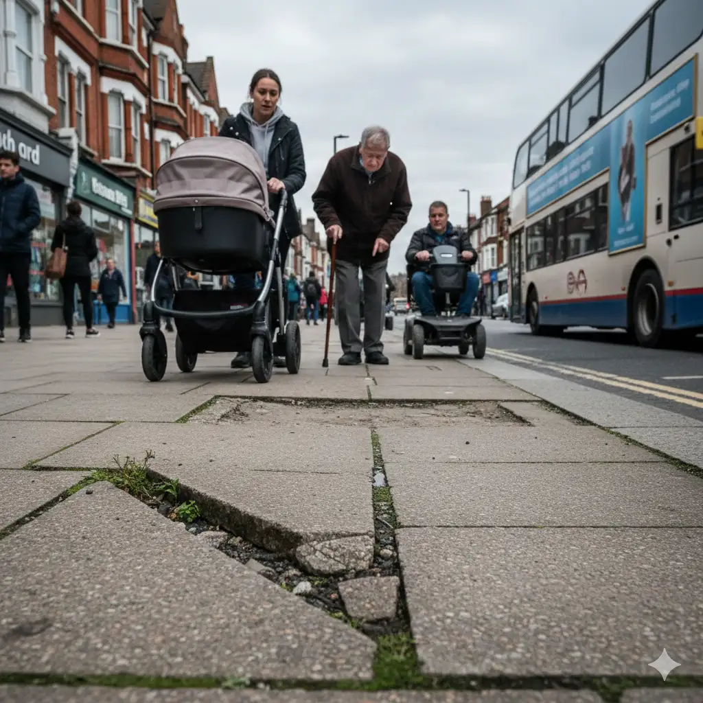 Broken pavements pose everyday risks for East London residents walking to shops, schools, or work. Uneven slabs or cracks can cause trips, especially for families with pushchairs, elderly walkers, or those with mobility needs.