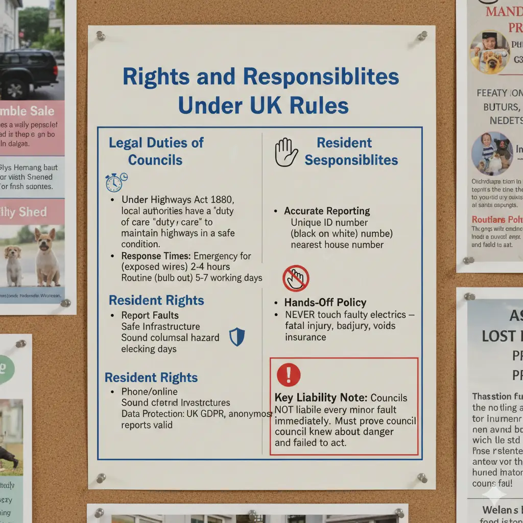 UK law places street lighting under local authority duties via the Highways Act 1980, requiring councils to maintain safe roads. Residents have the right to report faults and expect reasonable response times.