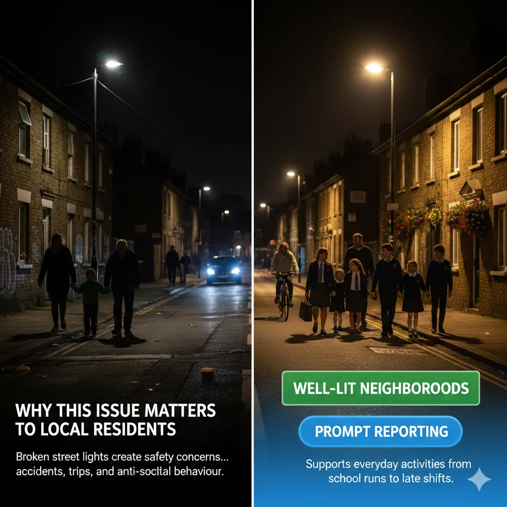 Prompt reporting helps maintain well-lit neighbourhoods, supporting everyday activities from school runs to late shifts.