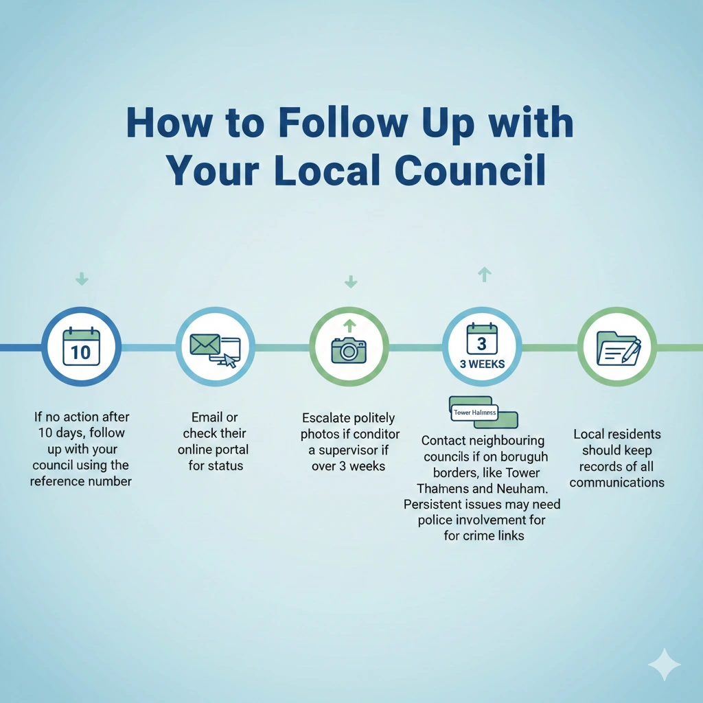 Contact neighbouring councils if on borough borders, like Tower Hamlets and Newham. Persistent issues may need police involvement for crime links.