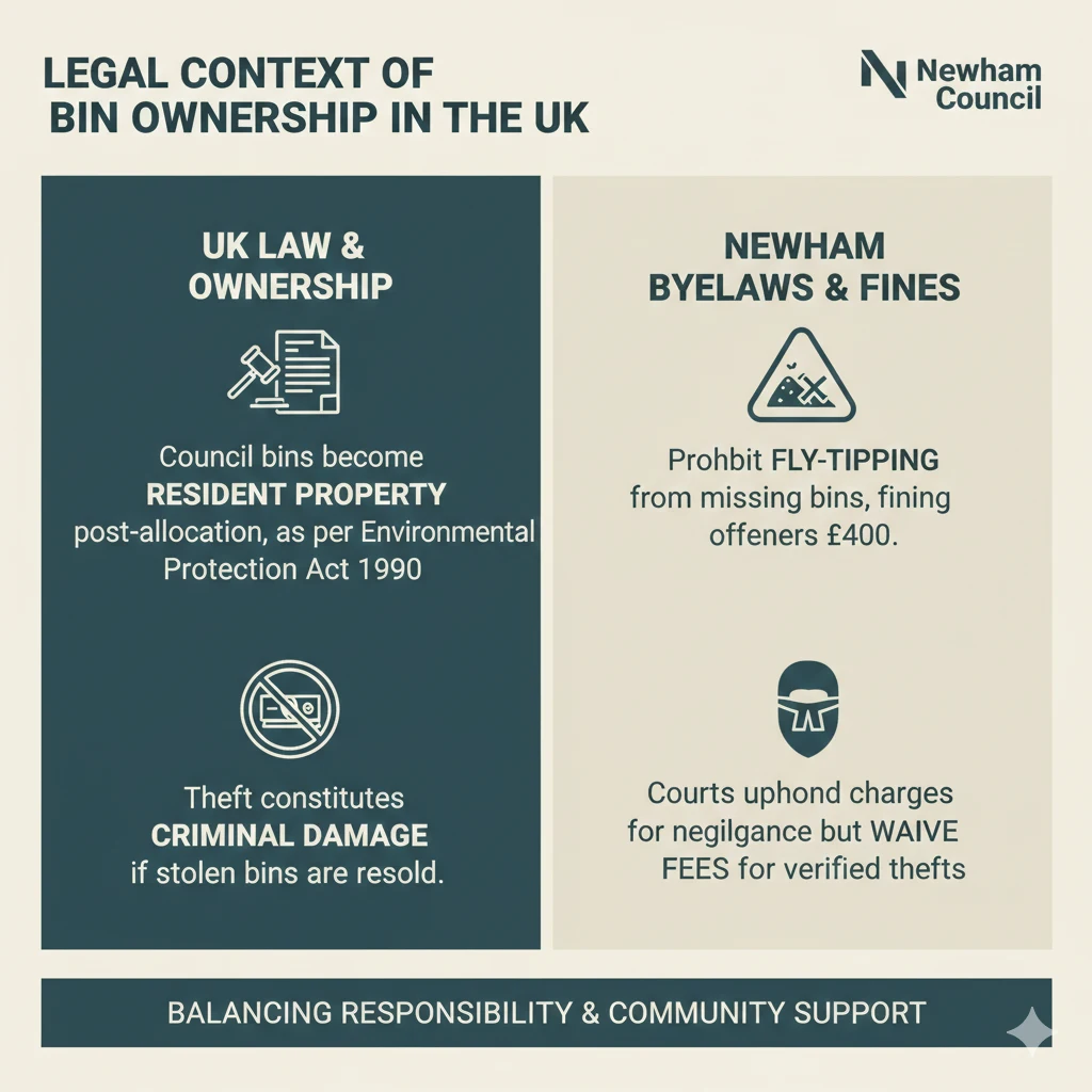 UK law deems council bins resident property post-allocation, per Environmental Protection Act 1990. Theft constitutes criminal damage if resold. Newham byelaws prohibit fly-tipping from missing bins, fining £400.