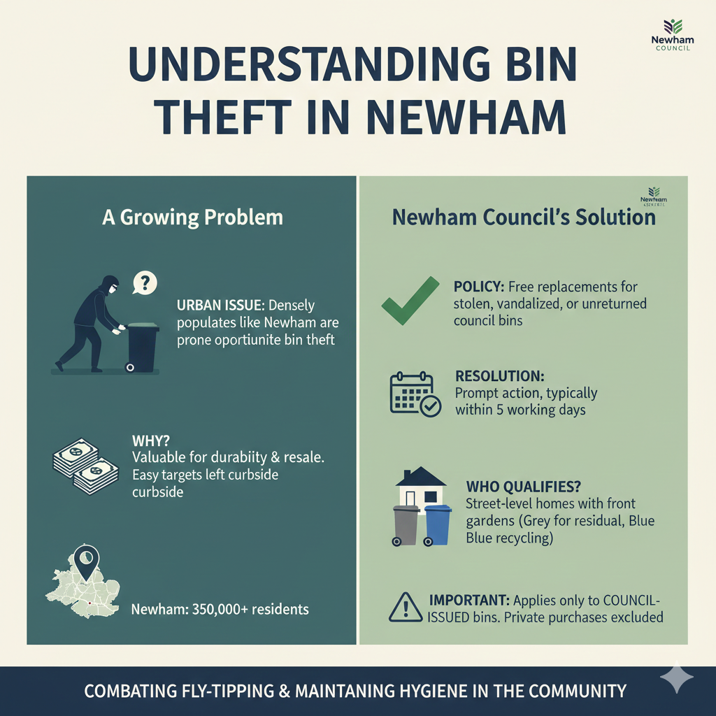Bin theft has become a surprisingly common issue in urban areas like Newham, where high population density and frequent collections make wheelie bins easy targets for opportunistic thieves. These containers, often left curbside overnight, are valuable for their durability and utility, sometimes resold or repurposed elsewhere. In Newham, households typically receive council-issued bins for general waste and recycling, distinguishing them from privately owned ones.